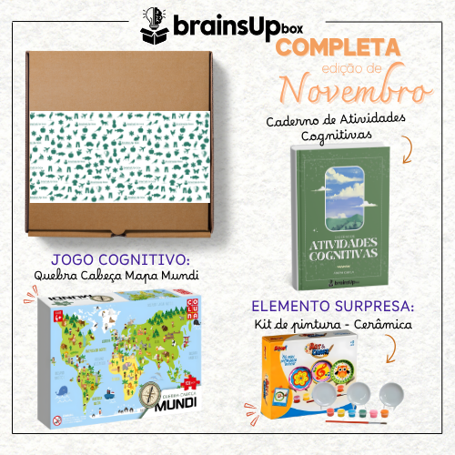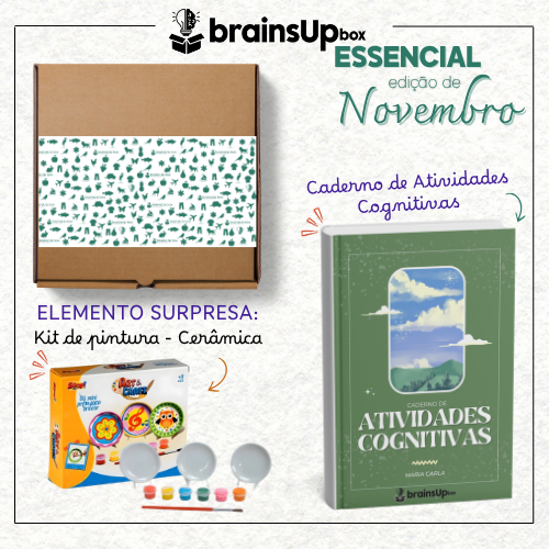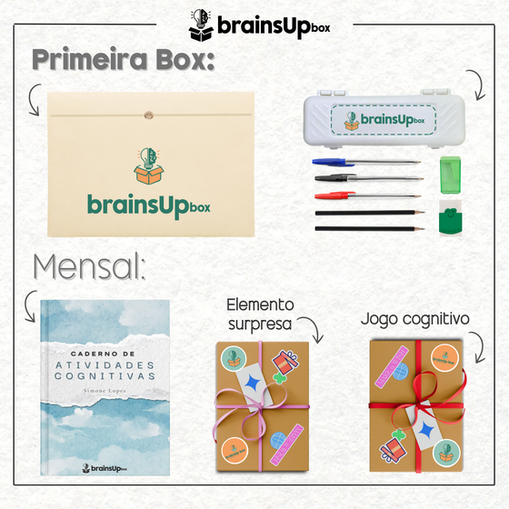 Cada box traz um convite ao cuidado mental: envelope em algodão cru com estojo, canetas, lápis, borracha e apontador — ferramentas essenciais para acompanhar os exercícios e registrar seu progresso cognitivo mês a mês.