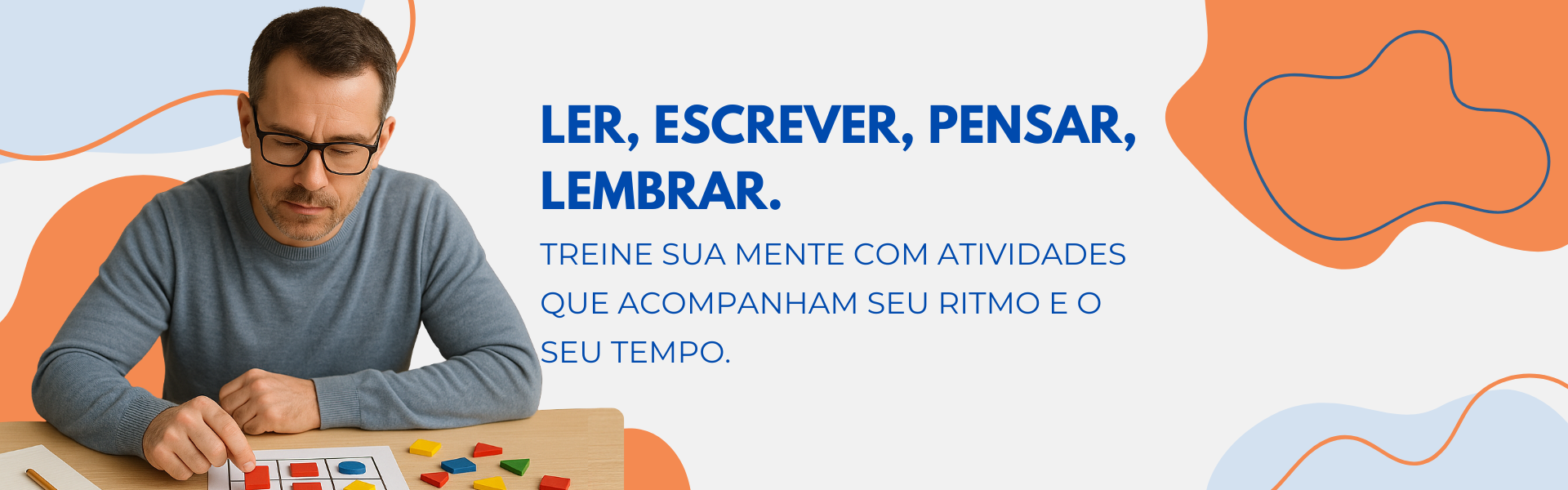 Caderno exclusivo com atividades para memória, atenção, lógica e raciocínio, em ordem progressiva e nova edição mensal. Conteúdo com curadoria técnica, disponível nos planos Essencial e Completo.